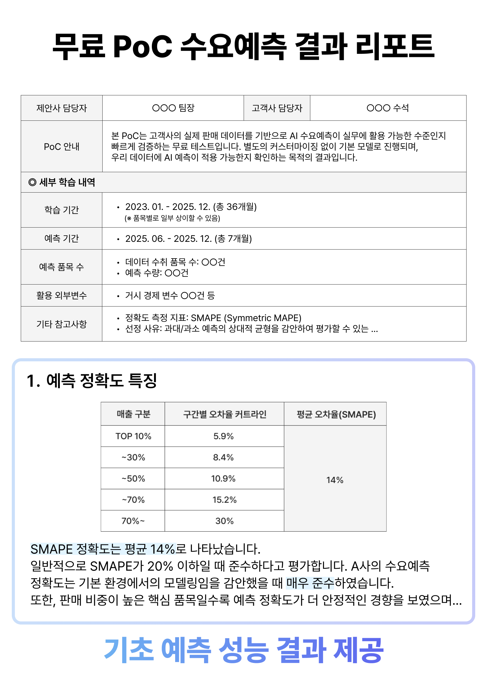 본 PoC는 고객사의 실제 판매 데이터를 기반으로 AI 수요예측이 실무에 활용 가능한 수준인지 빠르게 검증하는 무료 테스트입니다. 리포트에는 예측 정확도, 품목별 예측 결과(그래프), 예측 트렌드에 대한 설명이 포함됩니다.